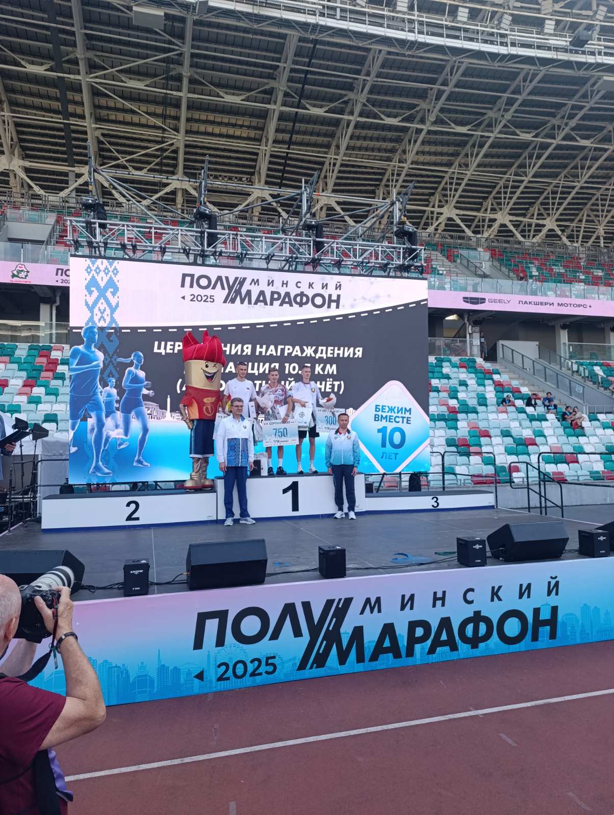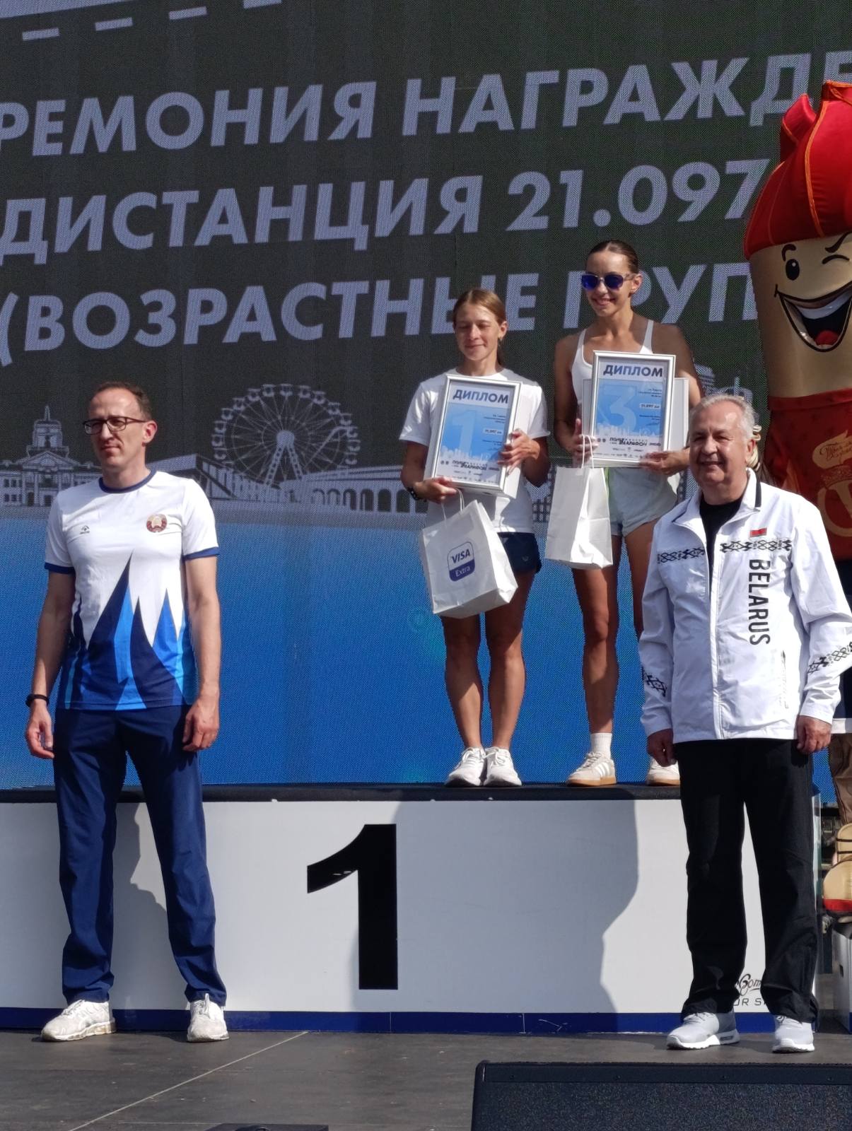 Глава администрации Ленинского района г. Минска Роман Мельник и генеральный директор Национального олимпийского стадиона «Динамо» Александр Бут-Гусаим провели награждение победителей и призеров дистанции 21.097 км в возрастных группах.