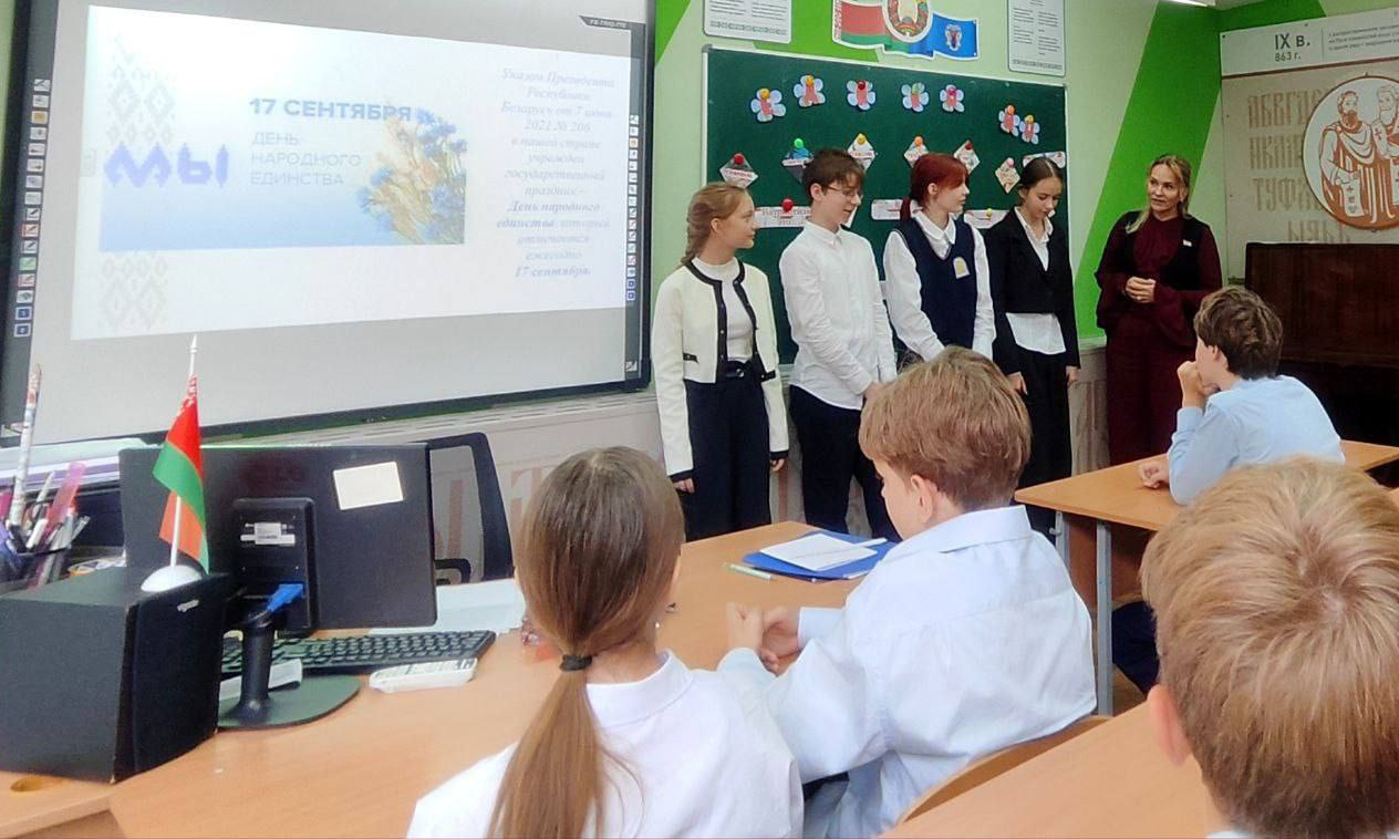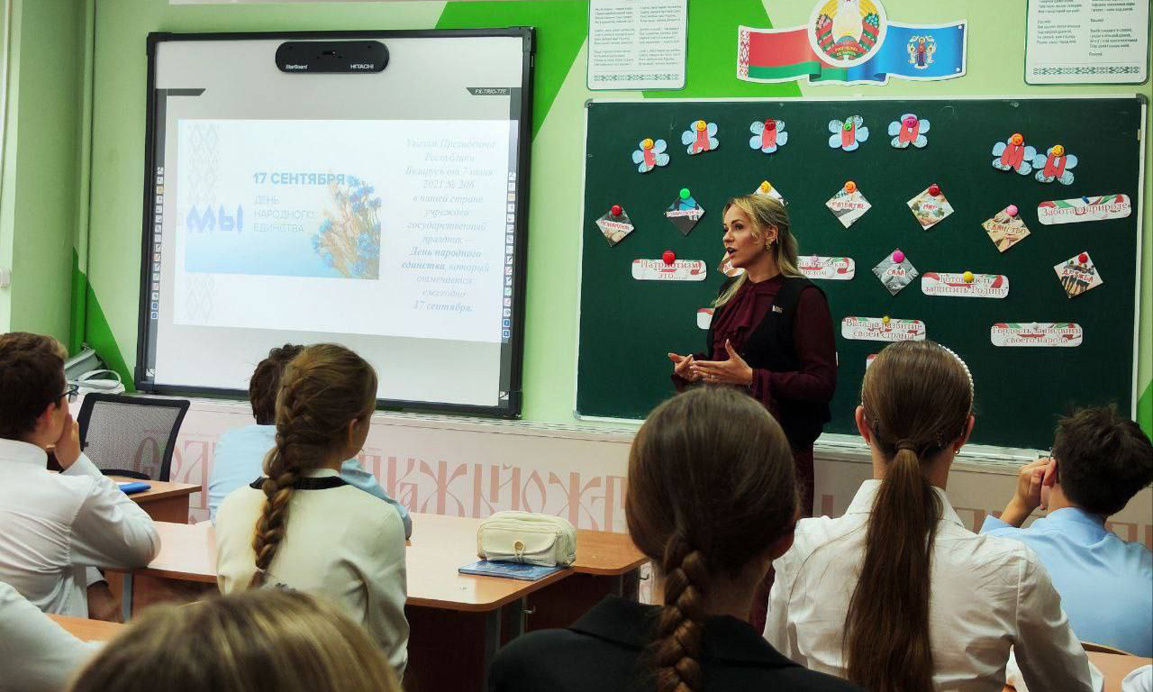 Депутат Мингорсовета Наталья Крупская в День народного единства посетила гимназию № 17, где поздравила коллектив и учащихся с праздником. Она рассказала школьникам об исторической значимости этой даты, важности сплоченности, преемственности поколений. Встреча прошла в теплой и дружеской атмосфере, ребята смогли задать интересующие их