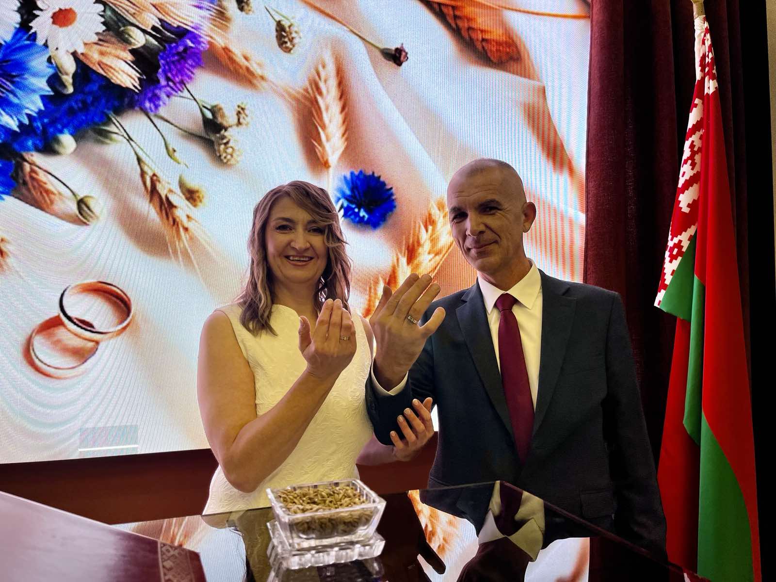 Новобрачные Ильяс и Светлана также пожелали заключить свой интернациональный семейный союз в необычной атмосфере 19 века. В кругу родных и близких молодожены обменялись обручальными кольцами, которые в национальных традициях искали в зернах жита — символе счастья и богатства белорусского народа.