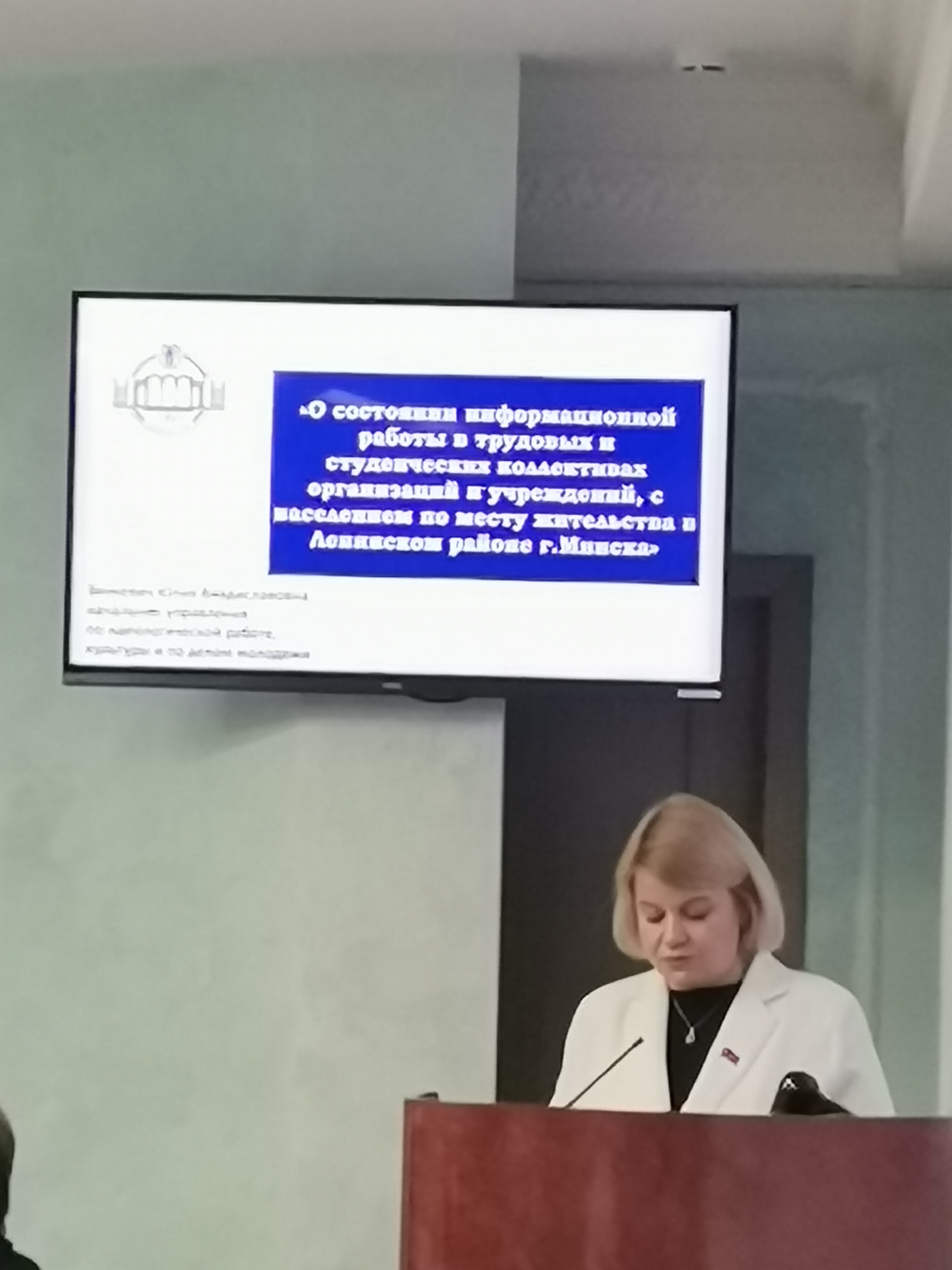 Третьим докладчиком выступила начальник управления идеологической работы, культуры и по делам молодежи Юлия Зинкевич. Был представлен план информационной работы в трудовых и студенческих коллективах и по месту жительства: цикл мероприятий, просветительские акции и проекты по вовлечению молодёжи в культурную жизнь района.