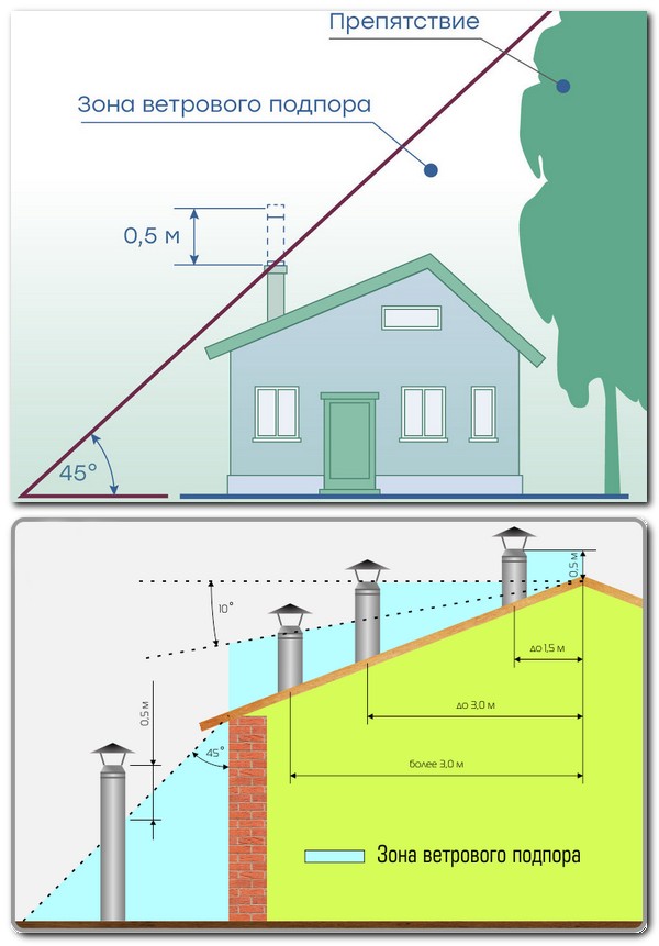 Зона ветрового подпора представляет собой пространство, находящееся ниже линии, проведенной под углом 450 к горизонту от наиболее высокой части здания, а также от верхней точки ближайшего строения или дерева. В этом пространстве ветер создает дополнительное давление, которое может влиять на движение продуктов сгорания в дымоходах и воздуха в вентиляционных каналах в том числе вызывать обратную тягу в результате чего угарный газ может попасть о в помещение.
